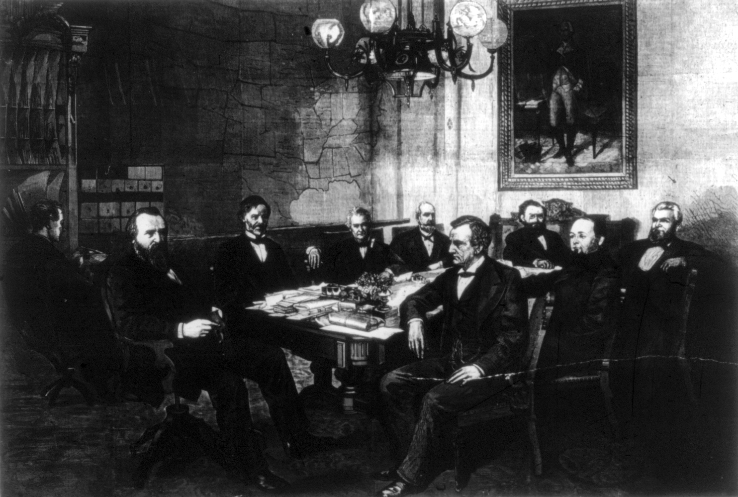 Karikatur von Thomas Nast, Fotografie von Carl Schurz 1879 (Fotograf unbekannt), Treffen des Kabinetts Hayes (Urheber unbekannt)