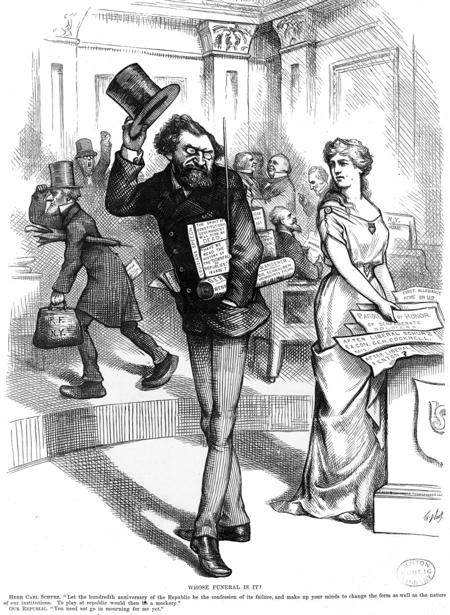 Thomas Nast, Public domain, via Wikimedia Commons1875 scheidet Carl Schurz aus dem Senat aus. Am 15. März 1876 stirbt Margarethe Schurz, zehn Tage nach der Geburt ihres Sohns Herbert. Im Präsidentschaftswahlkampf 1876 unterstützt Schurz den Republikaner Rutherford B. Hayes, der ihn nach seinem Amtsantritt 1877 zum Innenminister ernennt. Schurz ist der erste deutschstämmige Minister in der US-Geschichte.
